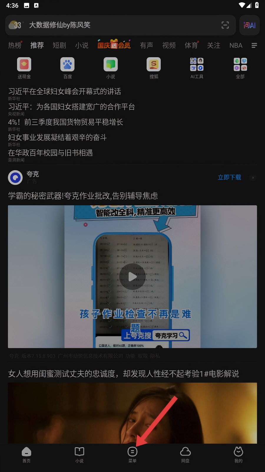 1、进入【UC浏览器】,点击底部【菜单】按钮,进入功能选择界面。