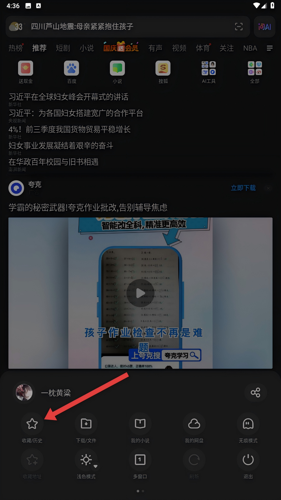 2、在弹出的菜单中,找到并点击【收藏或历史】选项,进入对应页面。