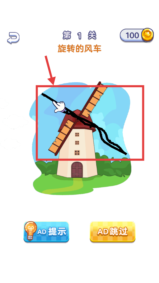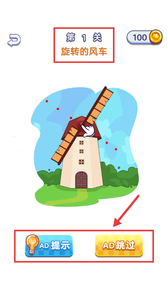2、关卡为【第1关-旋转的风车】,点击底部【AD跳过】按钮跳过广告开始挑战。