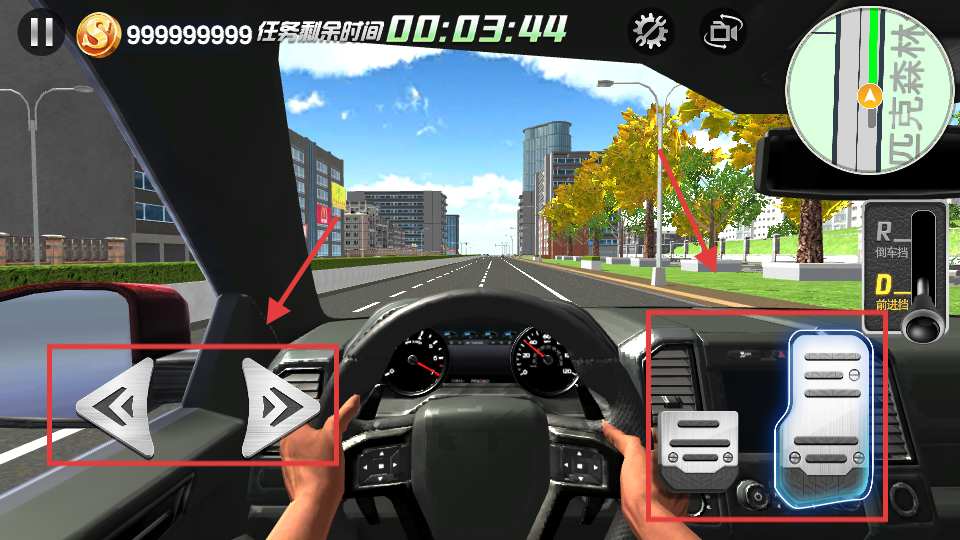 2、驾驶时,左侧方向按钮控制车辆转向,右侧踏板分别控制刹车与油门,挂【D】-【前进挡】后,合理操作踏板与方向,注意任务剩余时间。