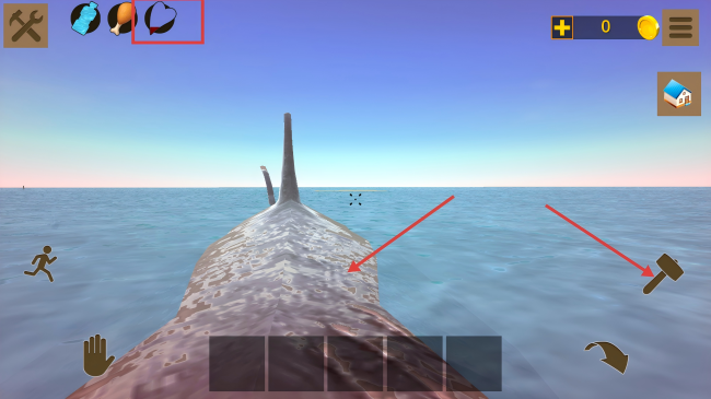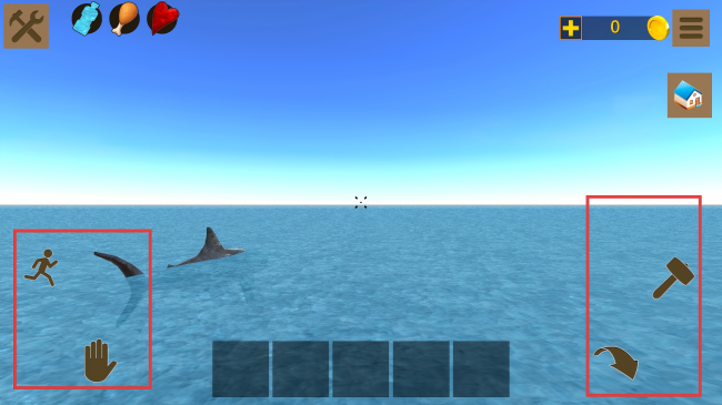 2、利用左侧移动和互动按钮,以及右侧工具按钮,在海上场景中行动,应对鲨鱼等危险。