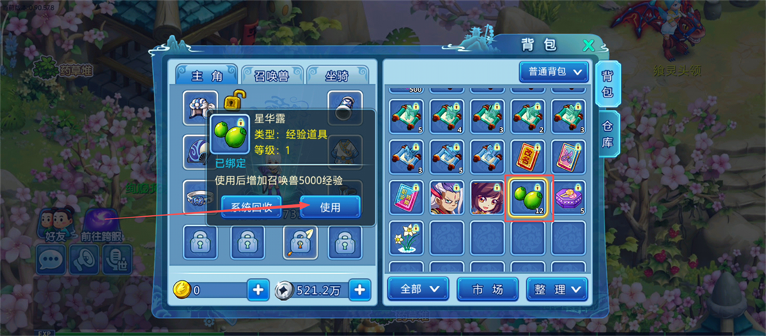 1、打开背包,找到【星华露】并点击【使用】,能为召唤兽增加5000经验呢。