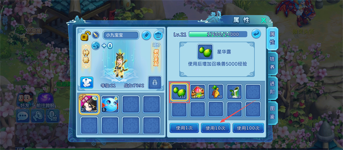 2、在属性界面,选择【星华露】批量使用10次,让神兽快速升级,战力提升后攻击伤害会更可观哦。