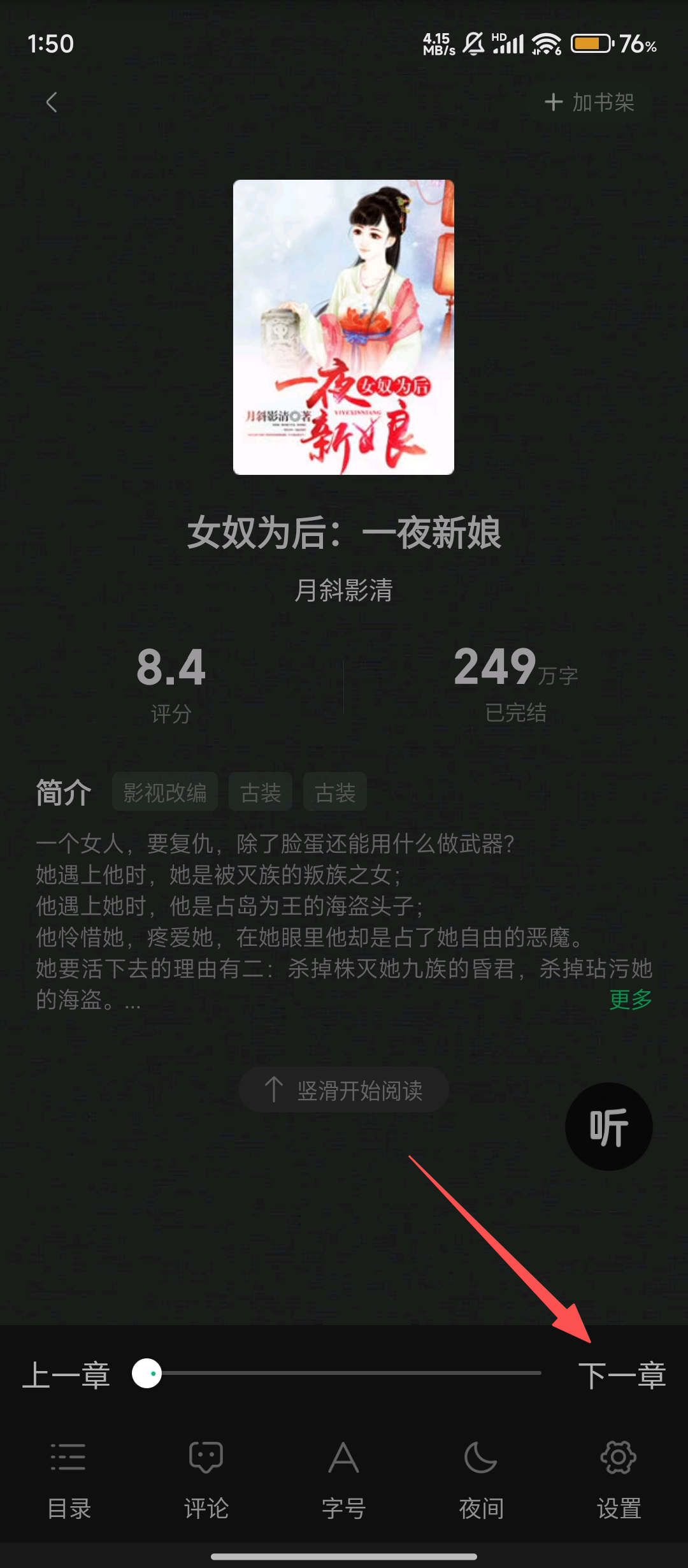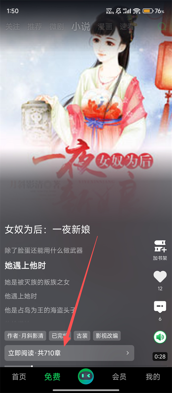 3、遇到想看的小说,比如【女奴为后一夜新娘】,我们点击【立即阅读-共710章】按钮,就可以开启阅读之旅啦。