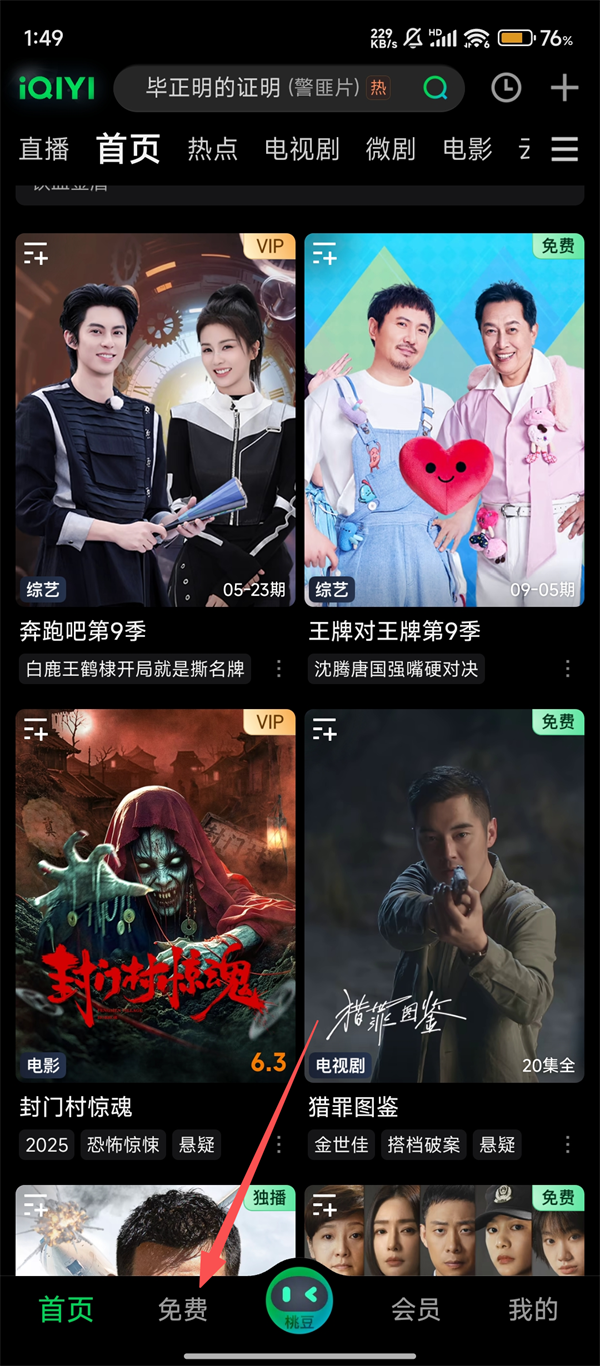 1、我们打开爱奇艺后,点击底部【免费】选项,就能进入到包含多样内容的页面啦,方便后续找小说。