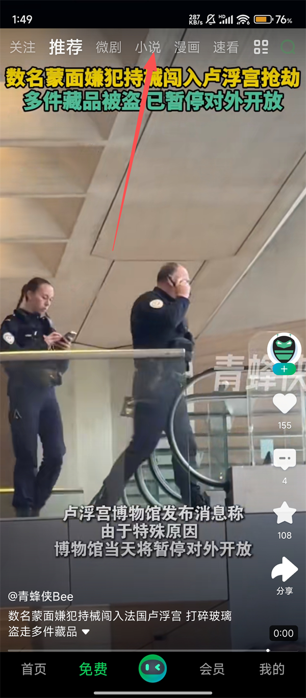 2、在免费页面的顶部导航栏里,我们点击【小说】标签,就能切换到小说专区,看看有哪些感兴趣的作品吧。