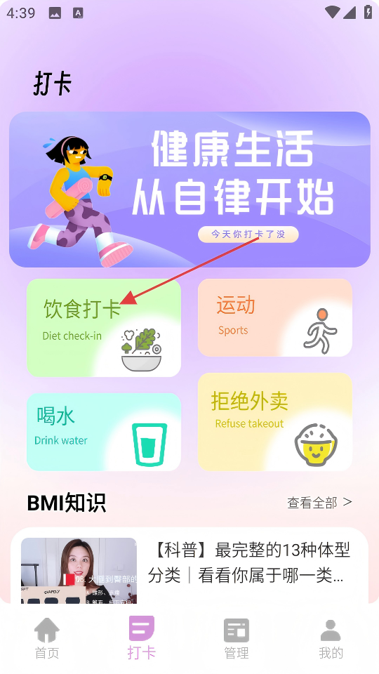 2、在打卡页面,点击【饮食打卡】,进入饮食记录页面。