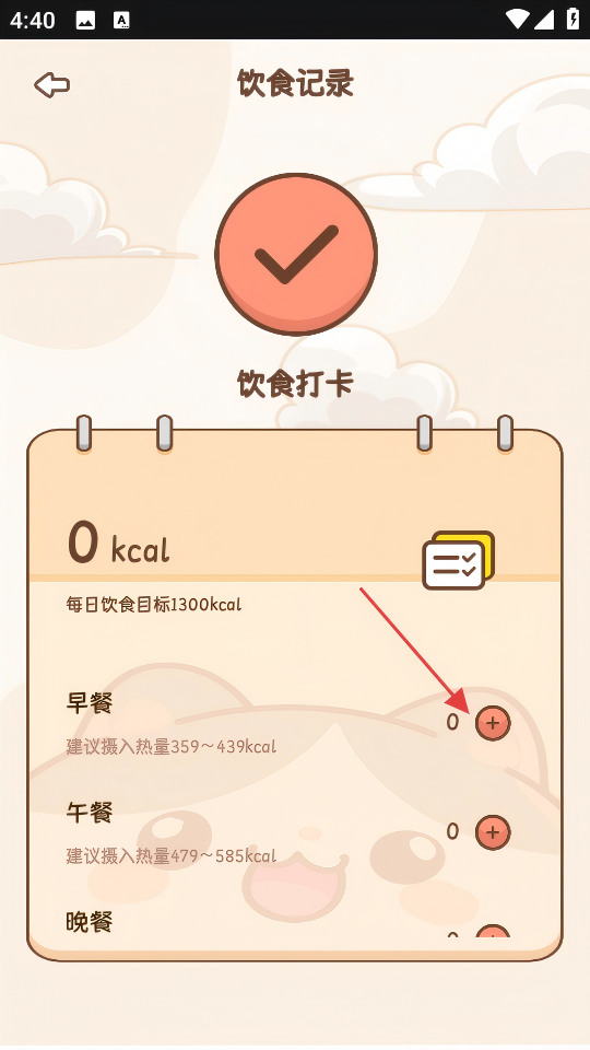 3、在饮食记录页面,点击早餐右侧的“+”按钮,准备添加早餐食物。