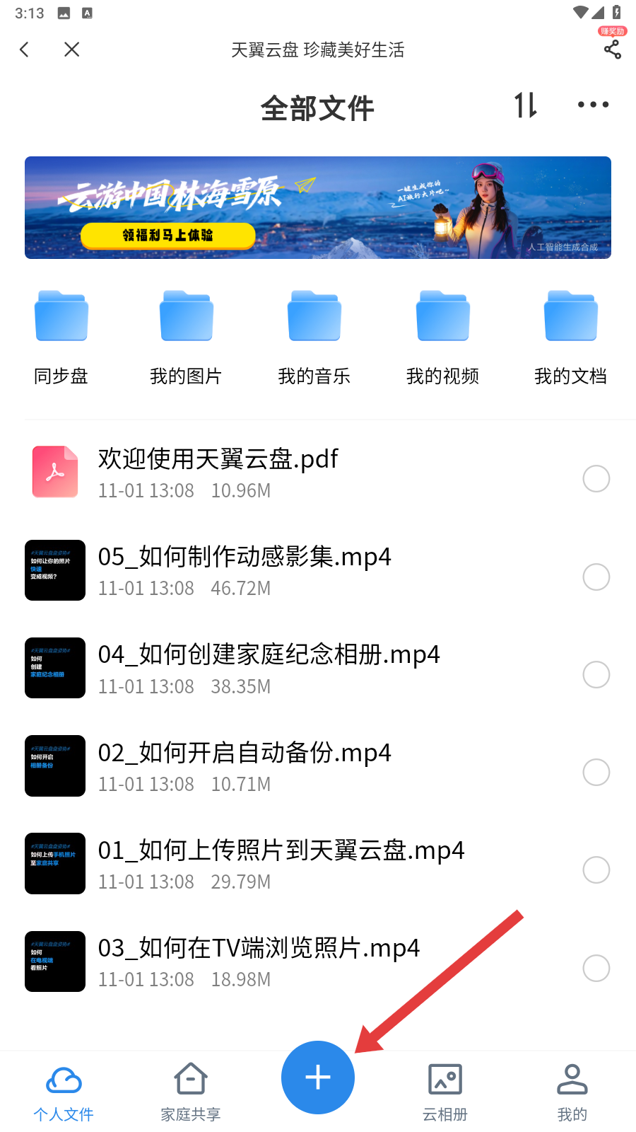 2、在天翼云盘【全部文件】页面,点击底部蓝色【+】号,就能展开上传等功能选项,方便进行文件操作啦。