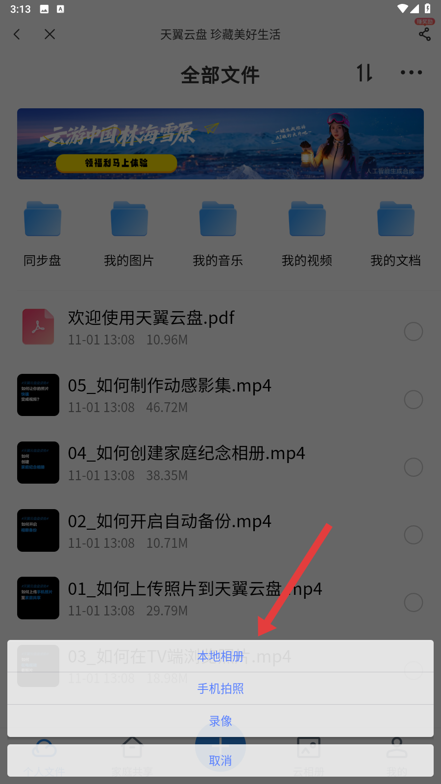 3、点击【+】号后,选择【本地相册】,即可从手机相册中选取要上传的图片或文件,轻松完成资源导入哦。