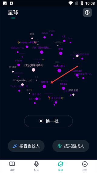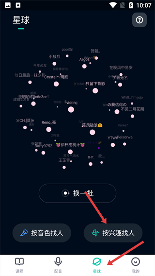 1、进入星球页面,点击【按兴趣找人】按钮,打开兴趣筛选界面。