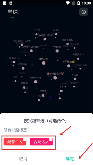2、选定【配音牛人】与【合配达人】标签,点击【确定】按钮,完成筛选。