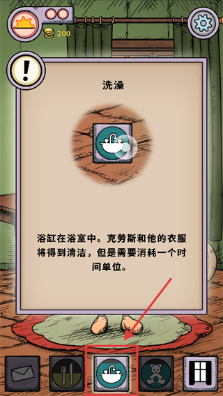 4、点击【洗澡】图标,消耗一个时间单位清洁克劳斯和他的衣服,需合理安排时间,保障卫生。
