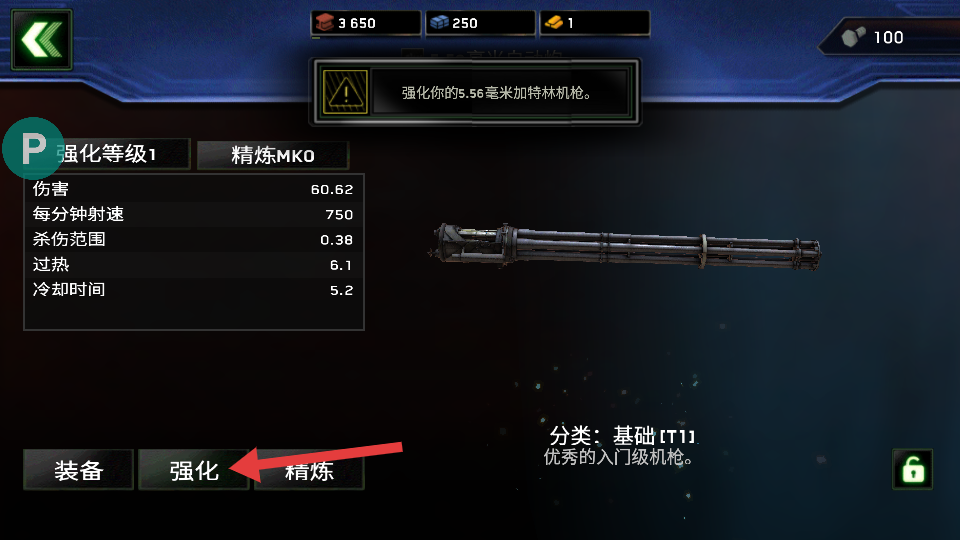 4、点击【强化】,提升5.56毫米加特林机枪属性,增强战斗能力。