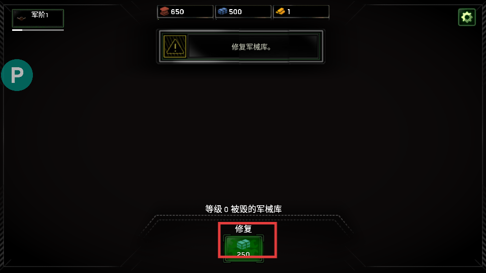 2、点击【修复】,花费资源修复军械库,完善游戏设施。