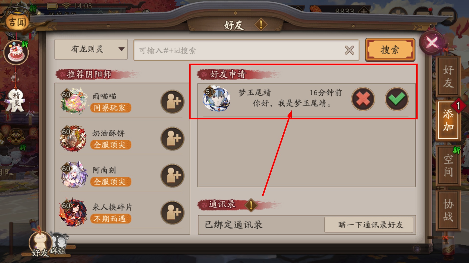 2、在好友申请栏找到【梦玉尾靖】的请求,点击绿色按钮通过申请,能扩展游戏内社交关系。