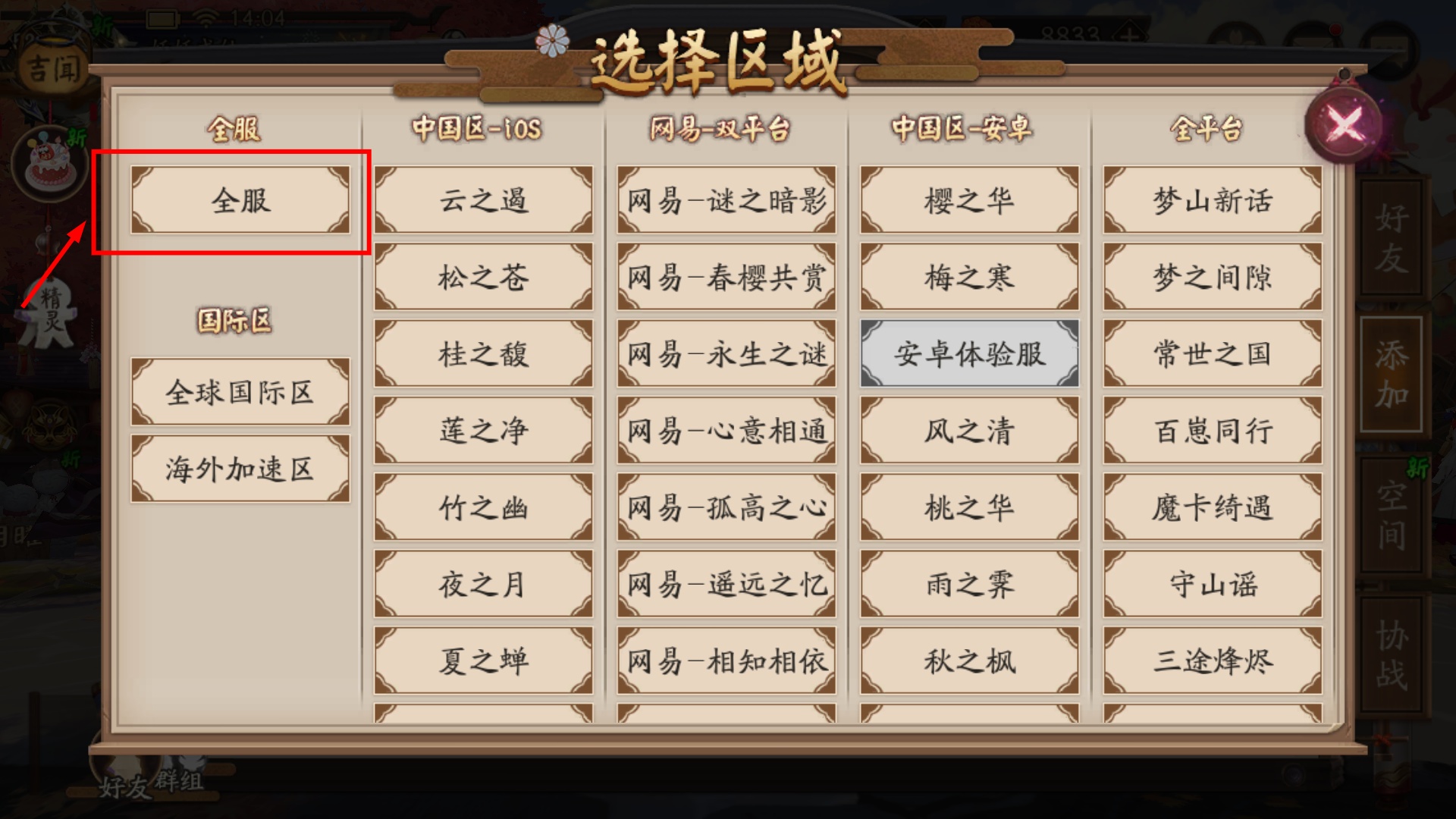 3、进入区域选择界面后,点击【全服】选项,切换到全服范围以便搜索目标好友。