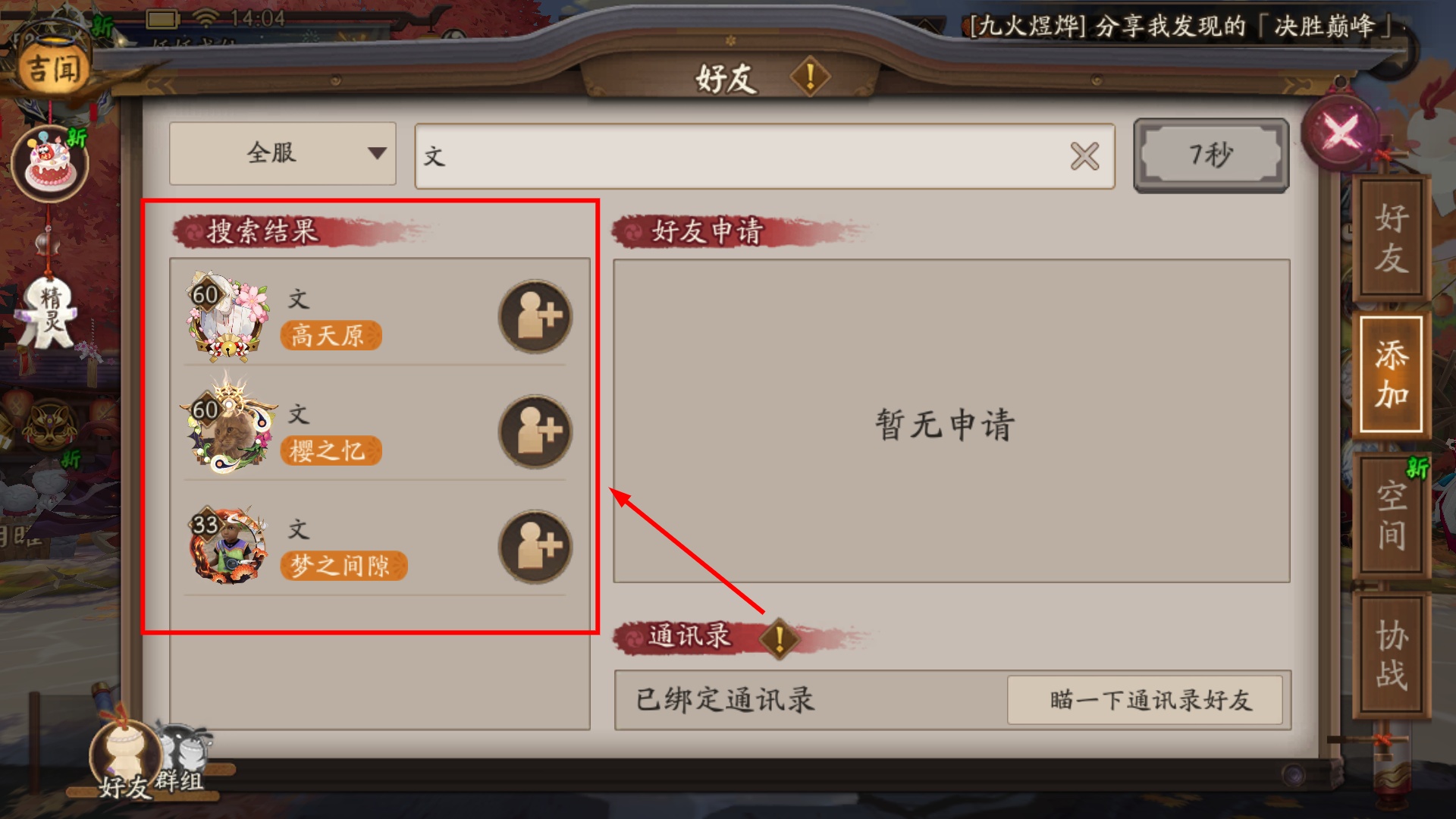 4、在搜索框输入内容后,查看【文】相关搜索结果,点击对应加号可添加符合条件好友。