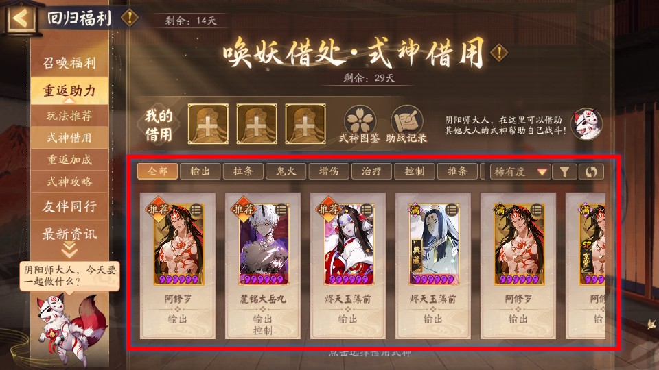 1、在【唤妖借处·式神借用】界面,根据战斗需求选择【输出】【治疗】等类型式神,提升战斗效率。