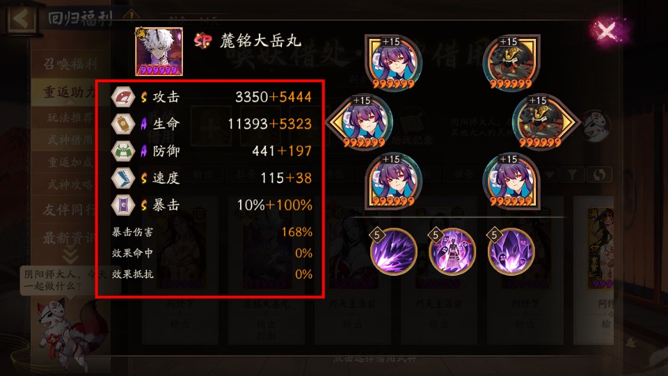 3、查看式神【麓铭大岳丸】的属性面板,关注【暴击】【速度】等关键数值,优化战斗配置。