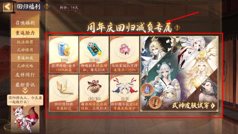 4、利用周年庆回归福利,如【50%】经验加成、御魂掉落增加,加快回归进度并提升收益。