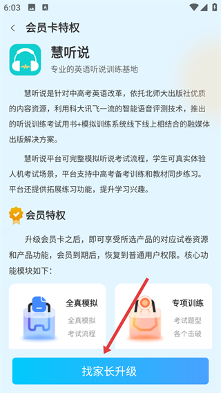 3、在会员卡特权页,点击底部【找家长升级】按钮吧。