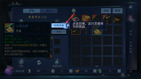 3、点击【召唤灵兽】按钮,召唤灵兽。