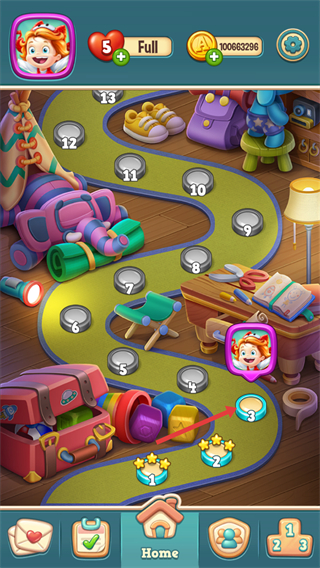 1、在关卡选择界面,点击数字【3】对应的关卡入口,消耗体力进入消除关卡,开启玩具主题的消除挑战。
