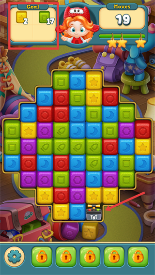 3、利用消除生成的【TNT】道具,点击触发范围消除,快速完成剩余目标,减少【Moves】消耗。