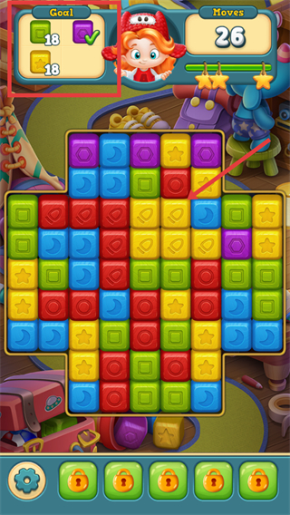 2、瞄准【Goal-18】的绿、黄方块目标,消除红框内的对应颜色方块,推进关卡目标进度。