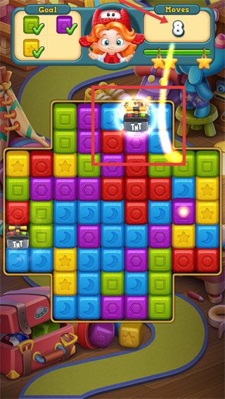 4、步数全部变成红框内的多个【TNT】连锁消除,获得高额得分,领取关卡奖励。