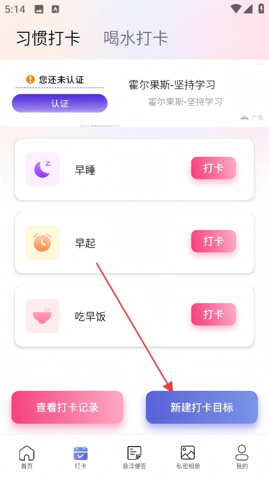 2、在习惯打卡页面,点击【新建打卡目标】,进入新建打卡目标页面。