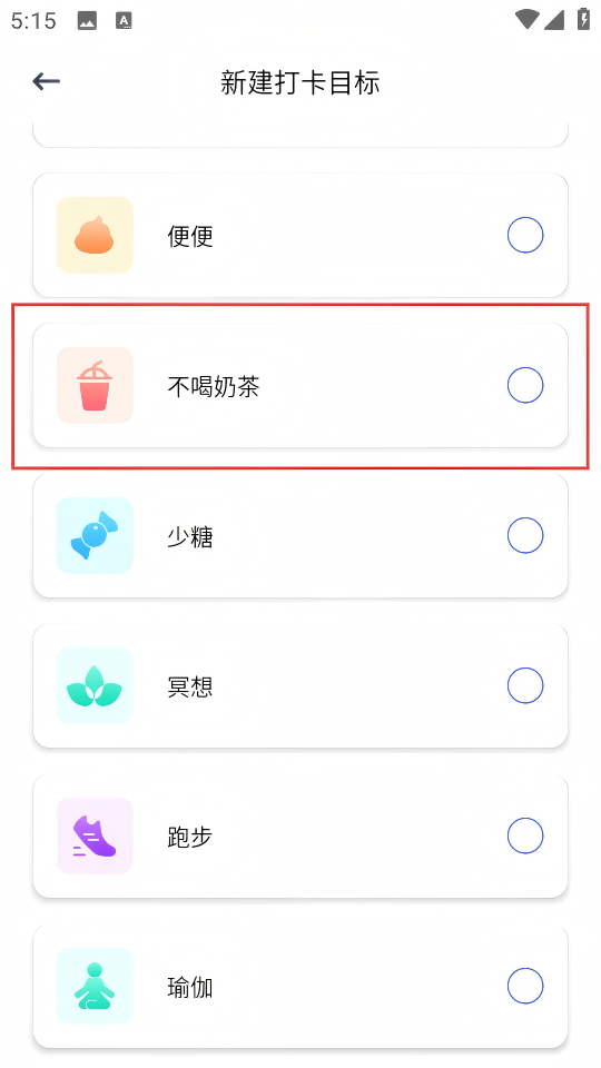 3、在新建打卡目标页面,选择“不喝奶茶”选项。