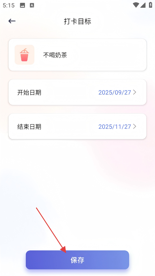 4、选择开始日期和结束日期后,点击【保存】,即可成功新建打卡目标。