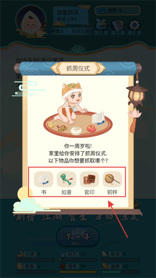 2、一周岁时参与抓周,从【书】【如意】【官印】【铜秤】选物品,影响初始发展。