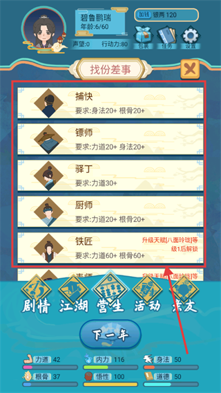 4、满足【捕快】【镖师】等差事要求后选择,获取收益或提升角色属性促进发展。