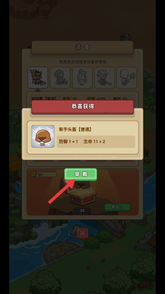 3、获得新手头盔后点击【穿戴】,提升防御和生命,增强角色生存能力。