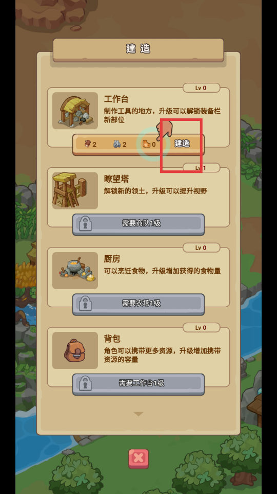 1、在建造界面点击工作台的【建造】按钮,制作工具,解锁装备栏新部位。