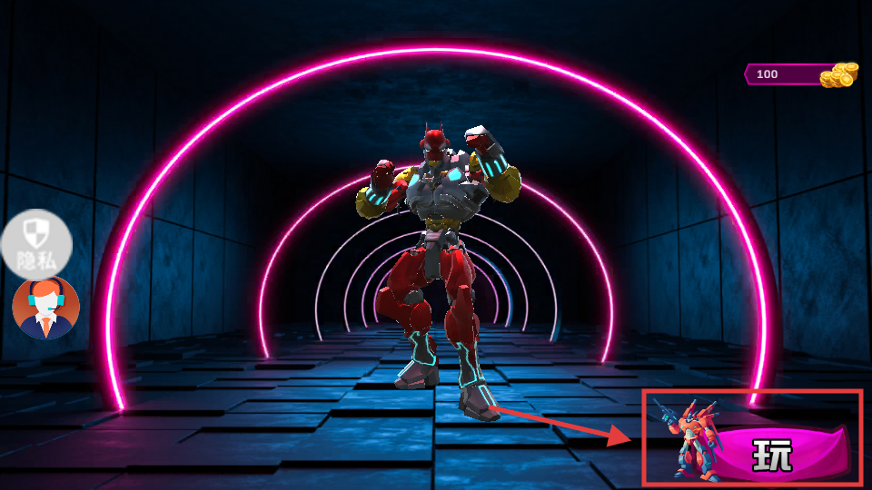 1、界面中选择【玩】按钮可进入游戏,操控【红-黄-银】配色机器人开启冒险,初始生命值为【100】。
