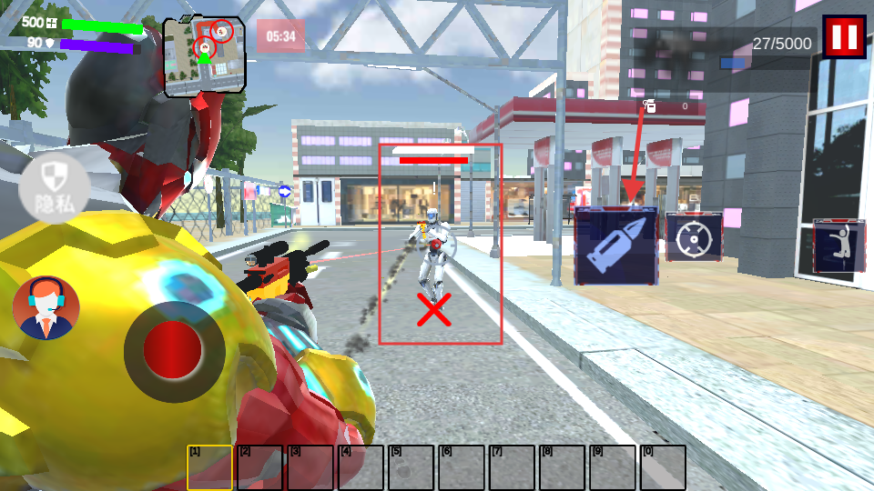 2、战斗场景需瞄准带【红-X】标记的敌人射击,注意左上角【05:34】时间限制和【27/5000】杀敌进度。