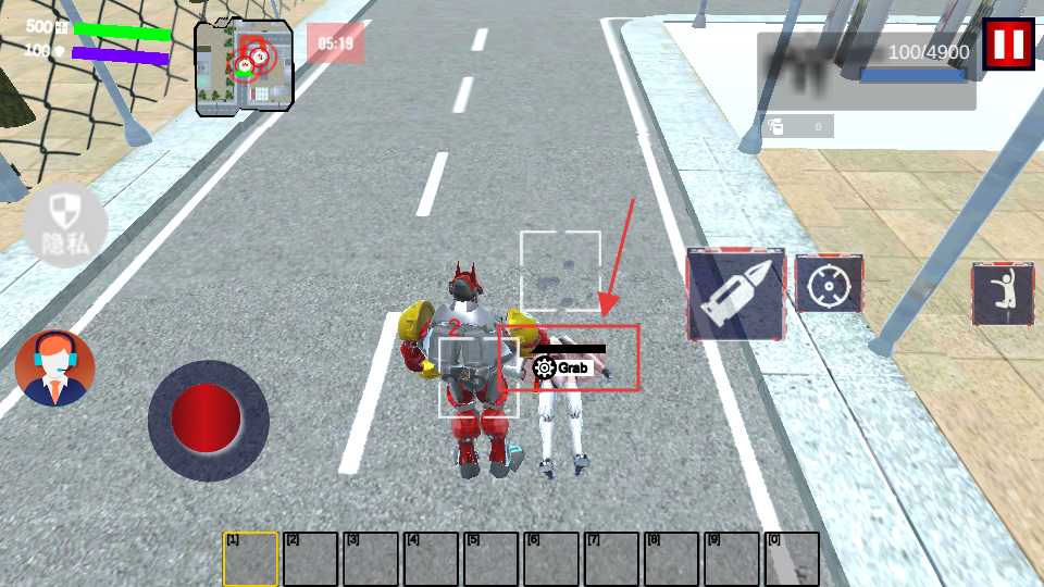 3、靠近敌人时触发【Grab】抓取功能,可捕获敌方机器人,配合界面右侧道具图标辅助战斗。