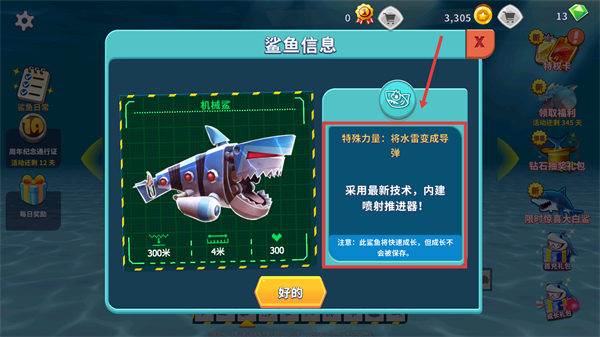 1、了解【机械鲨】的特殊力量,其能将水雷变成导弹且内建喷射推进器,助力探索海洋区域。