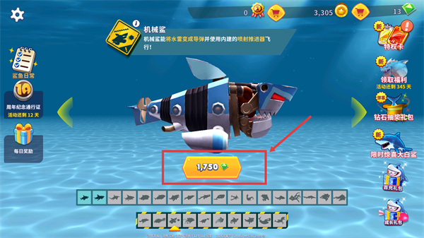 2、解锁【机械鲨】需消耗【1750】钻石,获取后可体验独特技能,提升海洋探索的效率。