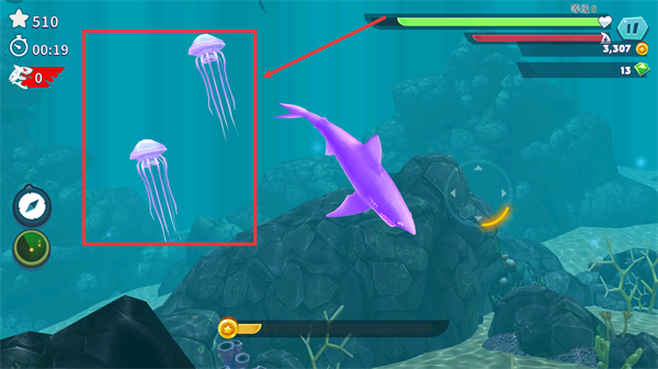 3、操控鲨鱼在海底探索时,留意周围的水母,灵活调整方向避开障碍,维持探索连贯性。