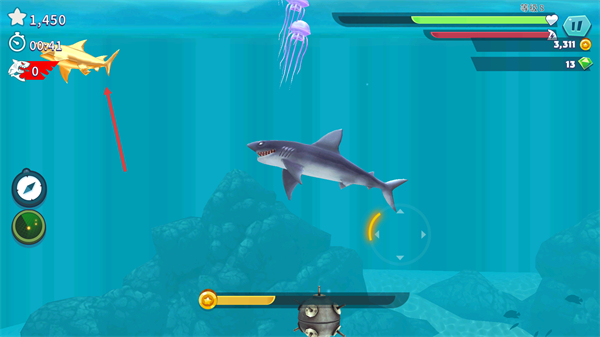 4、游戏中出现的金色鲨鱼有特殊属性,操控鲨鱼接近互动,可获取额外奖励提升自身能力。