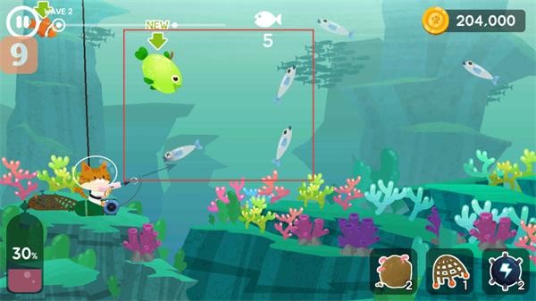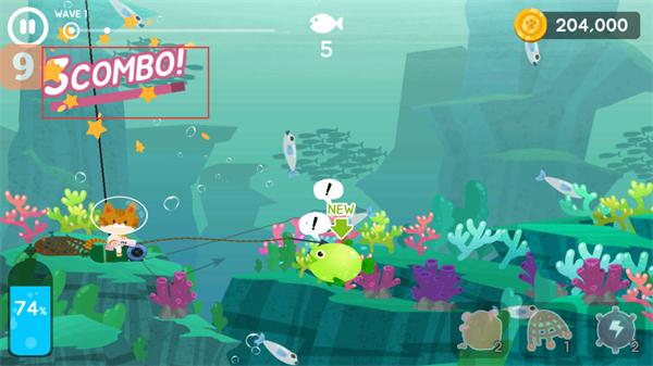 3、捕鱼关卡中瞄准带有【NEW】标识的鱼群,发射鱼叉进行捕捉,同时关注氧气瓶的剩余量。