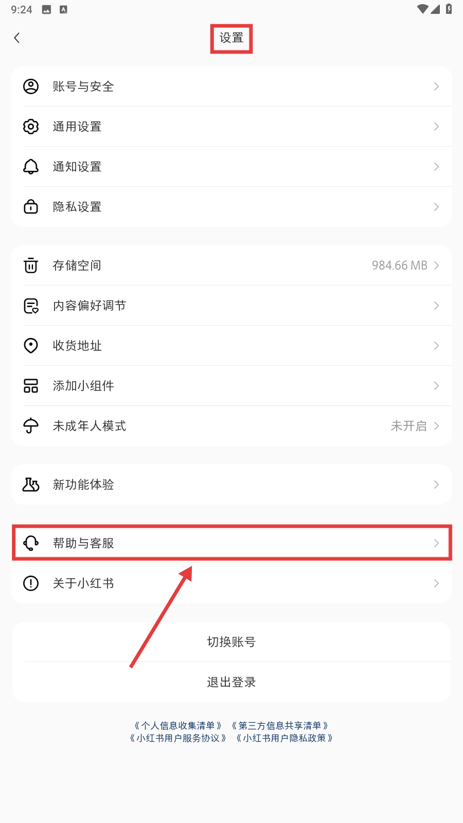 1、进入小红书【设置】页面后,点击【帮助与客服】选项,便能进入客服相关的界面啦。