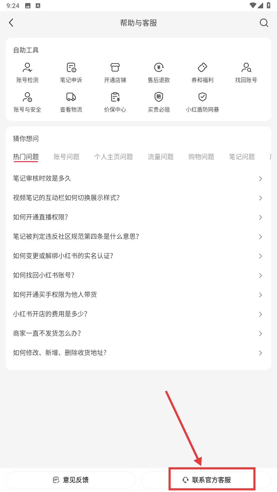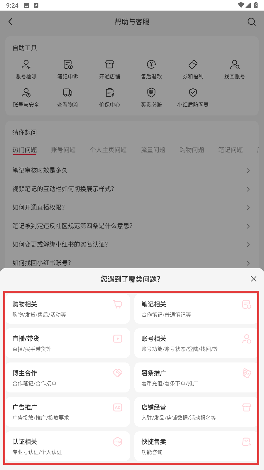 3、随后会弹出问题类型选择框,我们可根据需求选择【购物相关】、【笔记相关】等类别,精准反馈自己的问题。