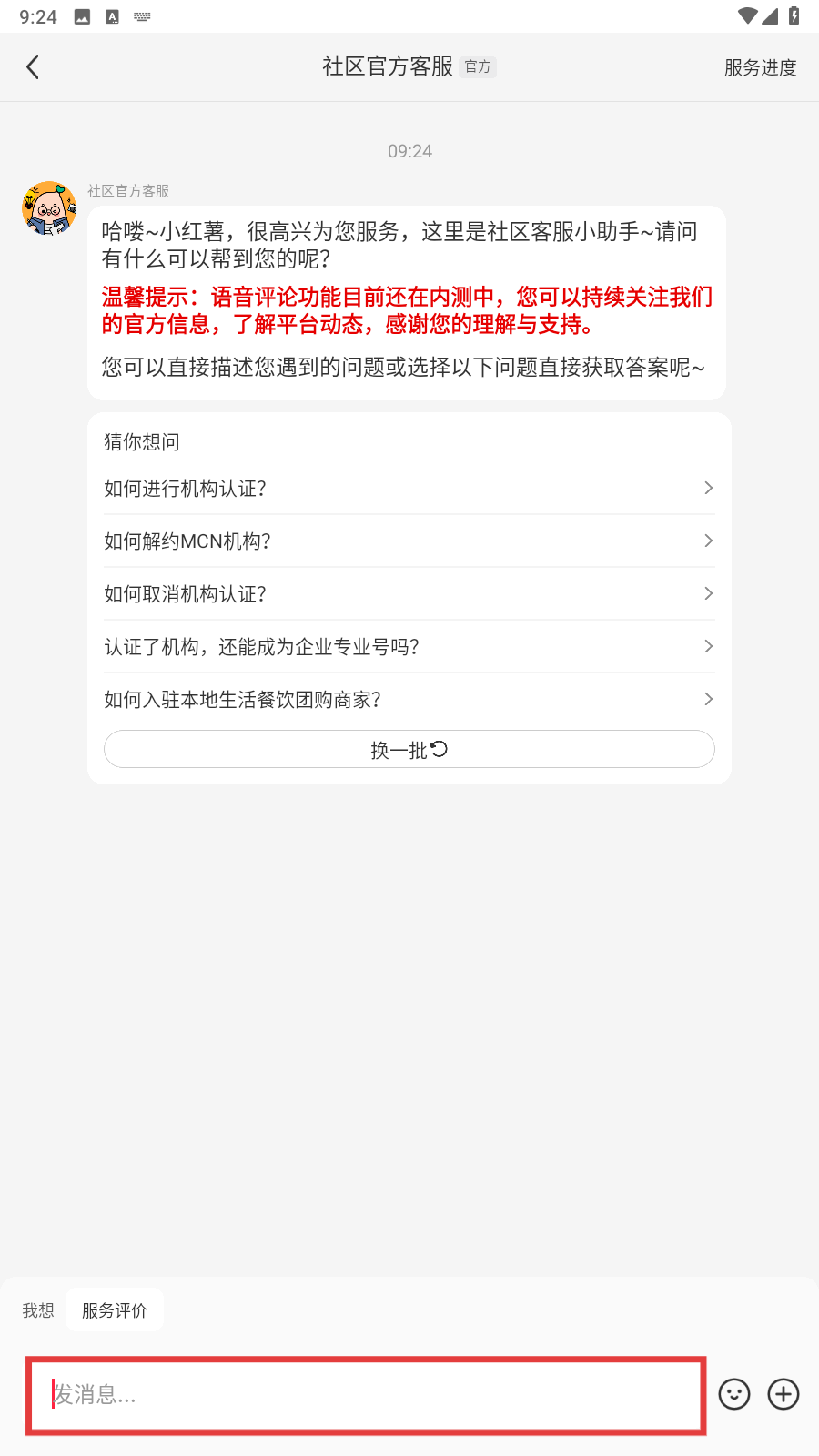 4、选好类型后,就进入客服对话页面,我们在底部输入框发送消息,便能和平台客服沟通啦。