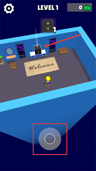 2、通过下方的虚拟摇杆(红色框内)控制角色移动,朝着【保险箱】方向移动。